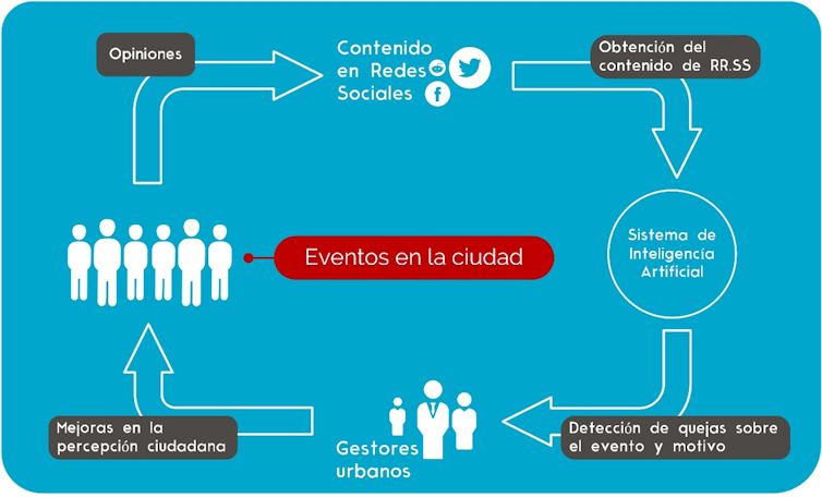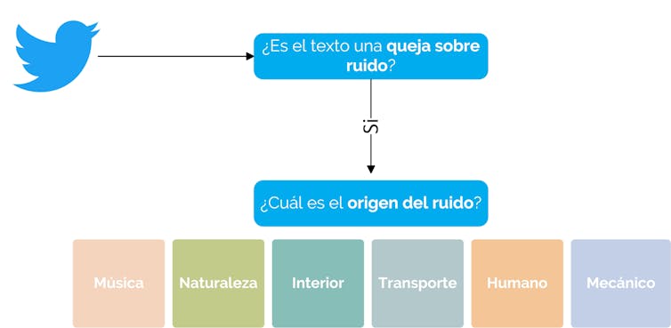 En primer lugar, el sistema extrae textos cortos compartidos en Twitter. A continuación, basándose en la presencia de términos relacionados con el ruido, el uso de emoticonos y las categorías gramaticales de las palabras del texto, un algoritmo de machine learning detecta las quejas relacionadas con el ruido compartidas por los usuarios.